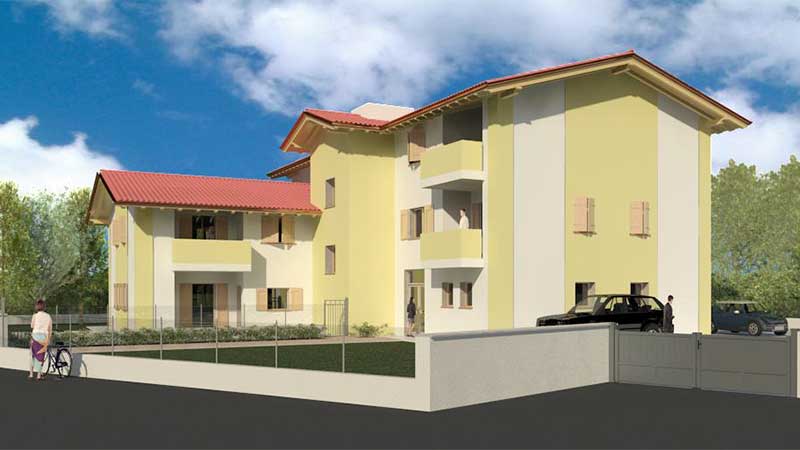 Intervento di costruzione fabbricato plurifamiliare a sei alloggi composto da un appartamento al piano terra con ampio giardino ad uso esclusivo, tre appartamenti al piano primo e due mini attici al piani secondo con terrazzi.