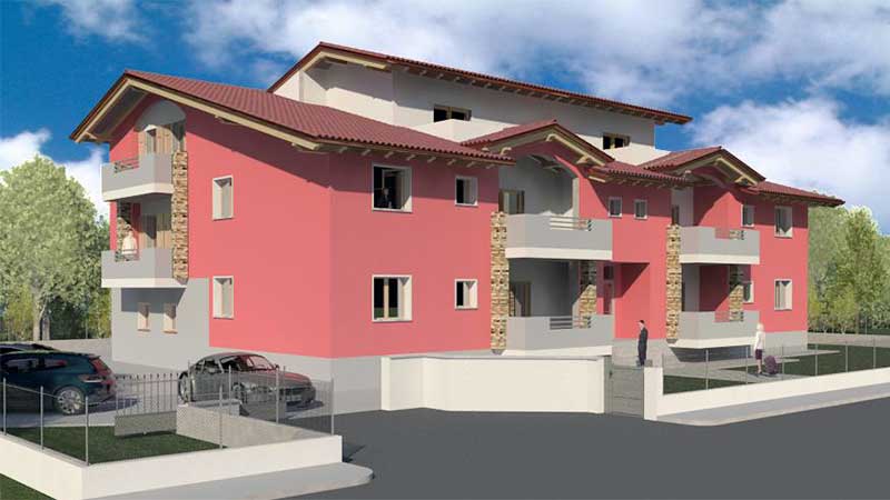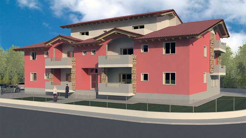 Intervento di costruzione fabbricato plurifamiliare a otto alloggi distribuiti su tre piani sfalsati, completo di otto autorimesse e posti auto scoperti.